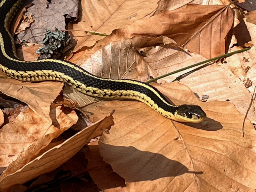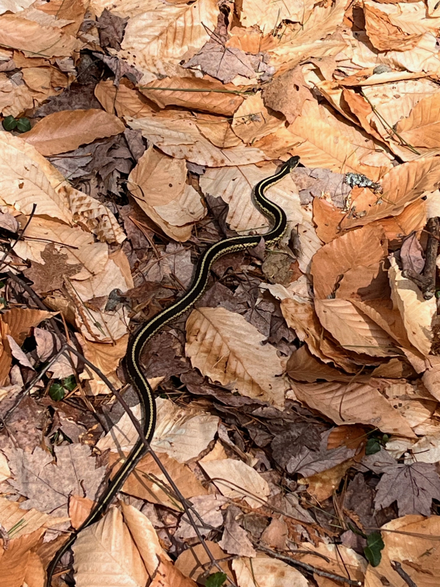Beautiful spring day in the North Country to encounter this garter snake moving across the trail. This is the first snake I've seen this spring.