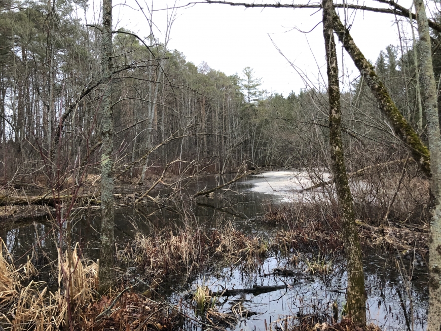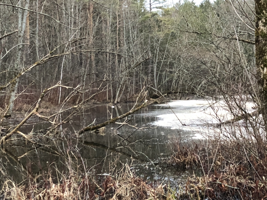 First night that I heard spring peepers, so I headed over to one of the wetlands on the SLU campus adjacent to the little river. I can't post the audio, but I could hear spring peepers and the occasional woodfrog (of which there may have been quite a few, but they were harder to hear over the roar of the peepers). You can clearly see that there is still a good deal of ice in the water. Spring is HERE!
