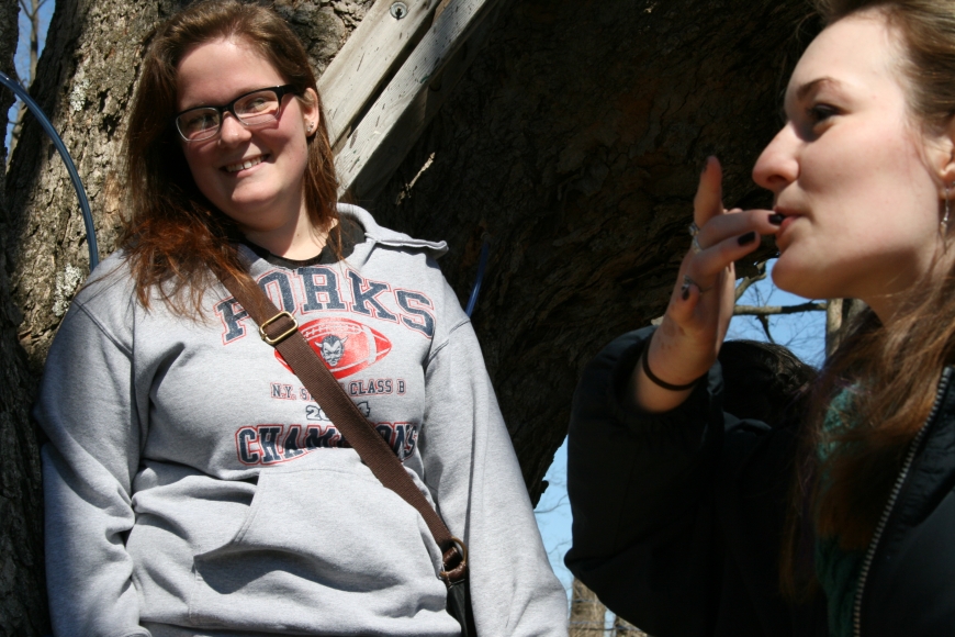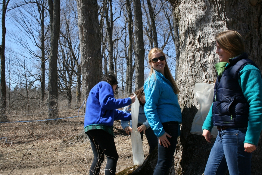 On Saturday April 6th Nature Up North had its first official outing! A group of 15 students from St. Lawrence University traveled to the Cornell Cooperative Extension Learning Farm for a maple sugaring tour and tasting. It was a beautiful spring-like day and much fun was had by all as we romped through woods, tasted sap straight from the tree, and did our fair share of work emptying bags and buckets overflowing with sap!