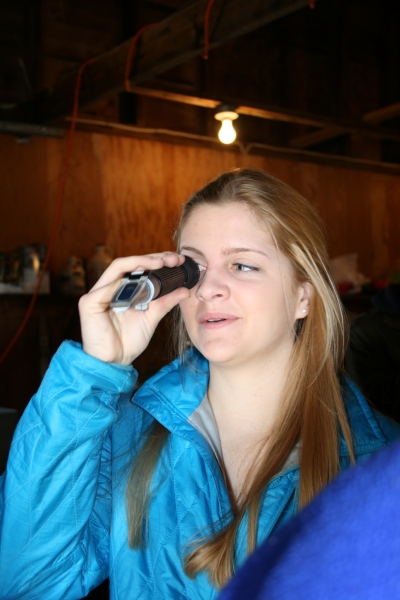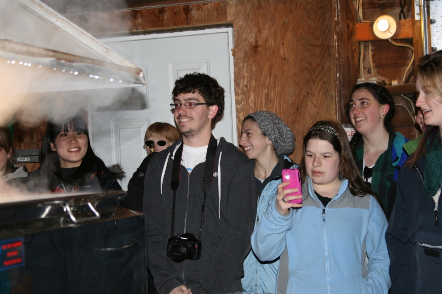 As our day at the sugar bush continued we clambered on hay bales, some of us jumping from bale to bale like Indiana Jones, and then made our way into the steamy sugar house where we learned how maple syrup is made. We got to look through a refractometer to see the sugar content of the sap we had collected. At the end of the day we all got the chance to taste-test the thick gooey goodness of local maple syrup drizzled over homemade cornbread. Yummmmmm!