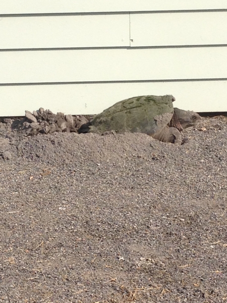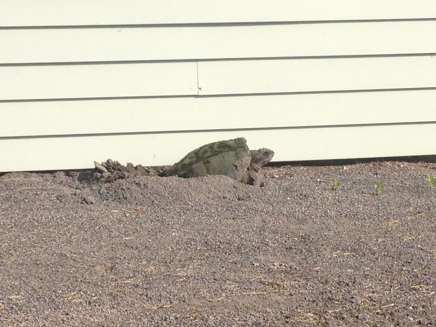 Mama snapping turtle (Chelydra serpentina) laying eggs! Females like to nest within 100 feet of water (the Little River was not far away) and in sandy or loamy soils. Snapping turtles are easily recognizable by their size, their long tail, and the jagged, saw-tooted rear edge of their upper shell (you can just make it out in this picture). They also have very powerful jaws which could easily crunch a finger or two. I gave this little lady plenty of space!