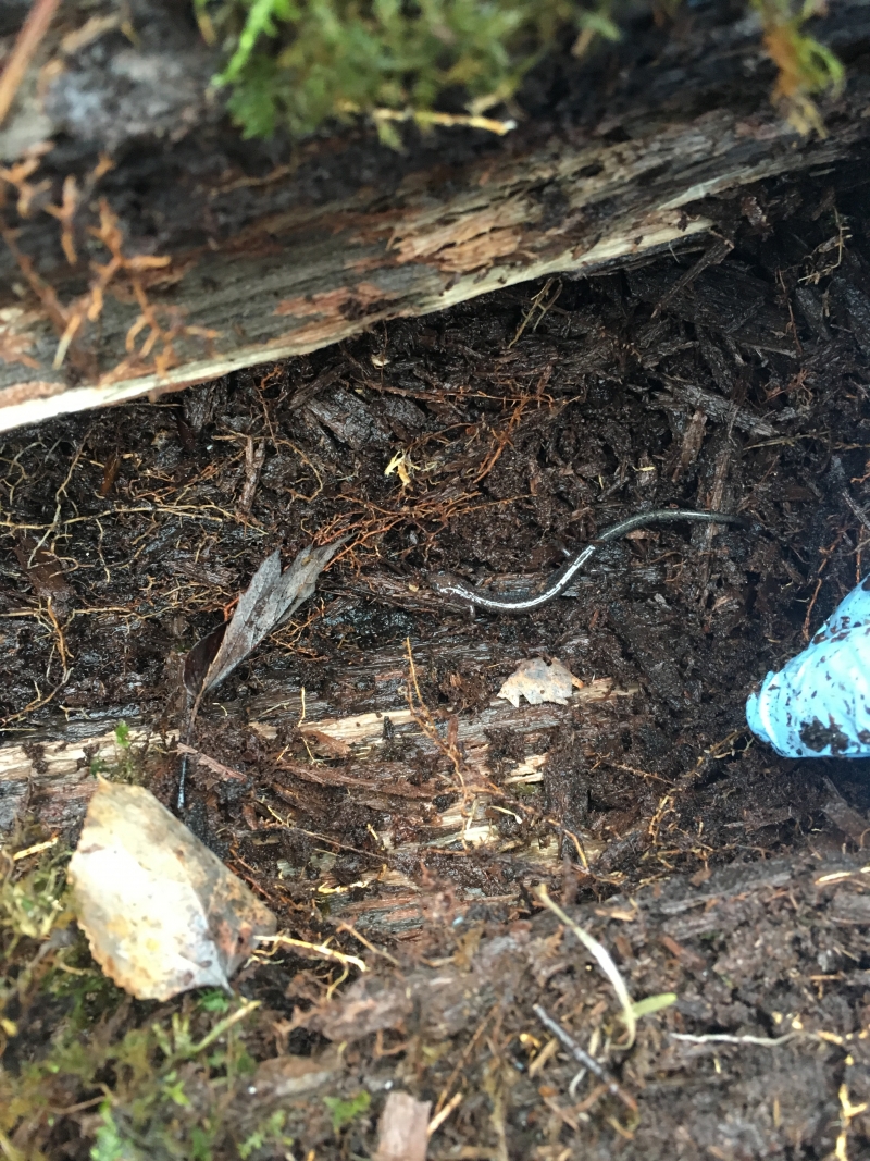 I flipped over a log and found this little lead-backed salamander shortly after I found a red-backed salamander. The lead-backed and red-backed salamanders are the same species (Plethodon cinereus) with different color morphologies.