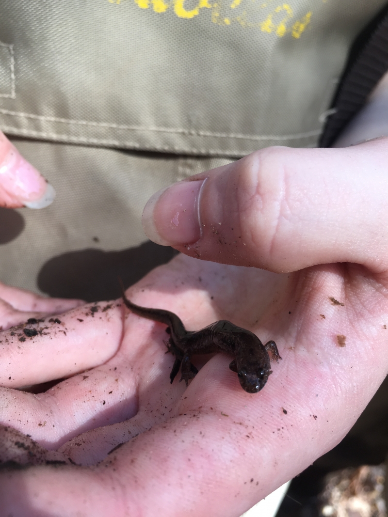 My herpetology class went out searching for herps in the glenmeal state forest on a wonderful warm and sunny afternoon for lab. Towards the end of the lab around 3:00 we started to search for dusky salamanders in a fast-moving steam. I lifted up a rock in the steam and saw this little guy swim away downstream. I just barely caught it so I could get a picture. I identified it as a dusky salamander (desmognathus fuscus) because it matched the coloration of a dusky salamander and it had a naso-labial groove that could aid in smelling.