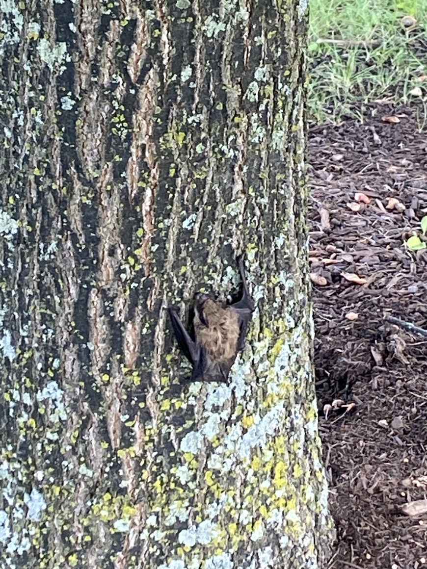 Walking in to work and spotted this little guy crawling across the sidewalk around 8am. Came back with an oven mitt to move him and found him climbing the tree. Came back around noon and found him still between the first branches sleeping. My buddy guess is Large Brown Bat. No obvious signs of white nose syndrome.