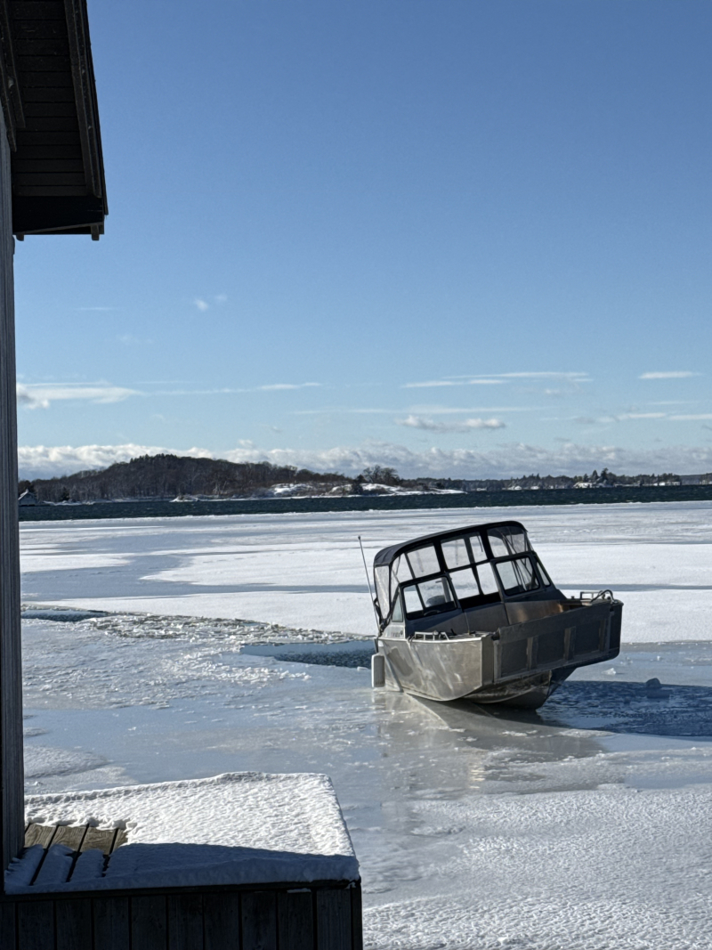 An uncle and I were attempting to break ice out to an island for duck hunting the next morning. We pushed a little too hard, and the boat popped up on top of the ice, about 6 inches thick. We had to call a family friend to come break us out.