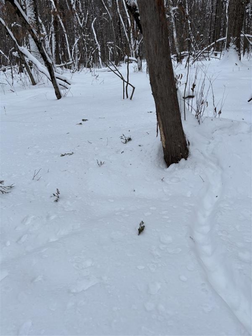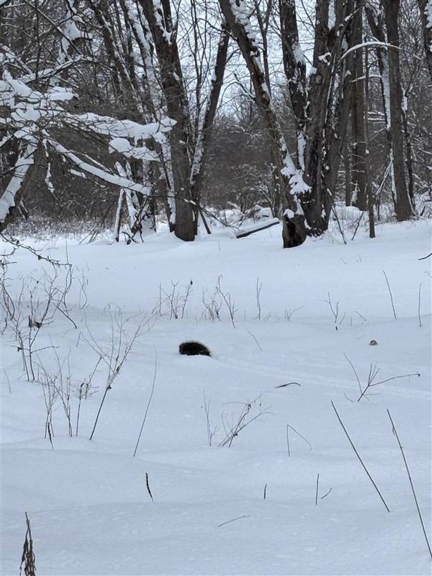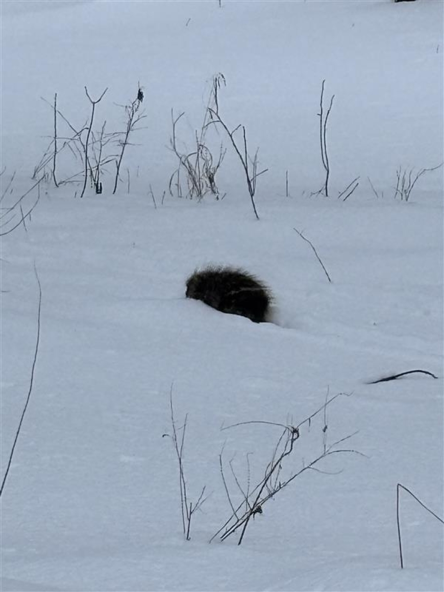These are photos shared with me by a community member, Blair Madore, who was snowshoeing the Kip Trail from the Pike Road trail entrance. This porcupine, tracks, and bite marks can be found about a mile down the trail at the first bridge you hit if you enter from Pike Road, or 1.5 miles down the trail at the second bridge if you start from the Wachtmeister Field Station.