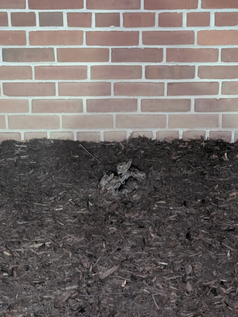 A photo shared with me by a student on campus of some rabbit kits in their den. Facilities later came by and filled the hole, presumably after relocating the family.