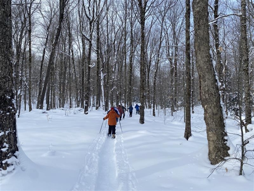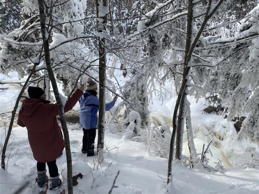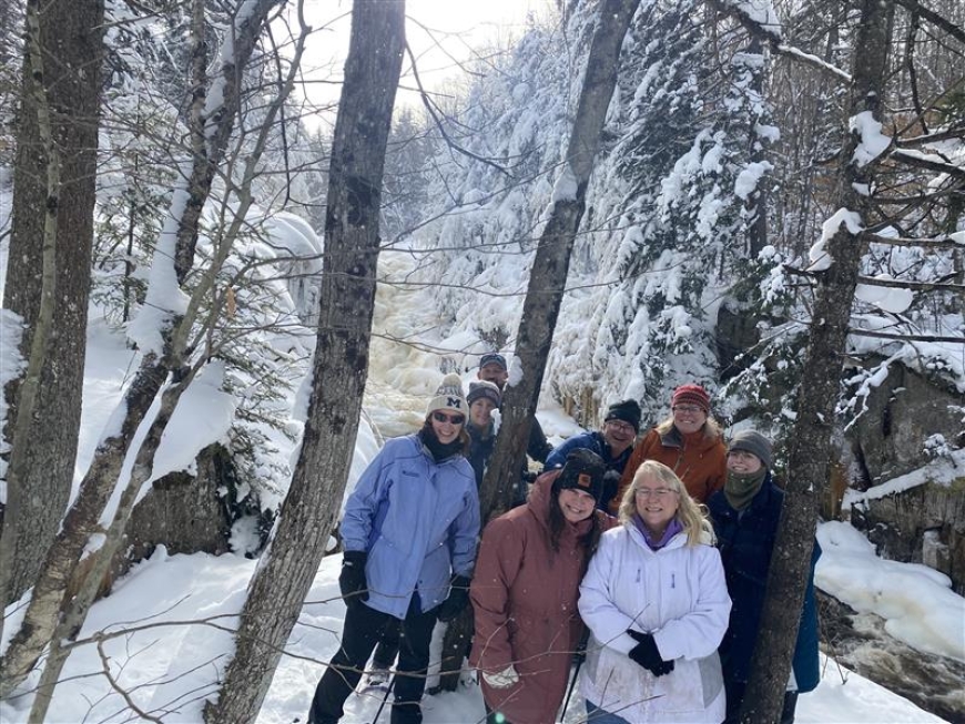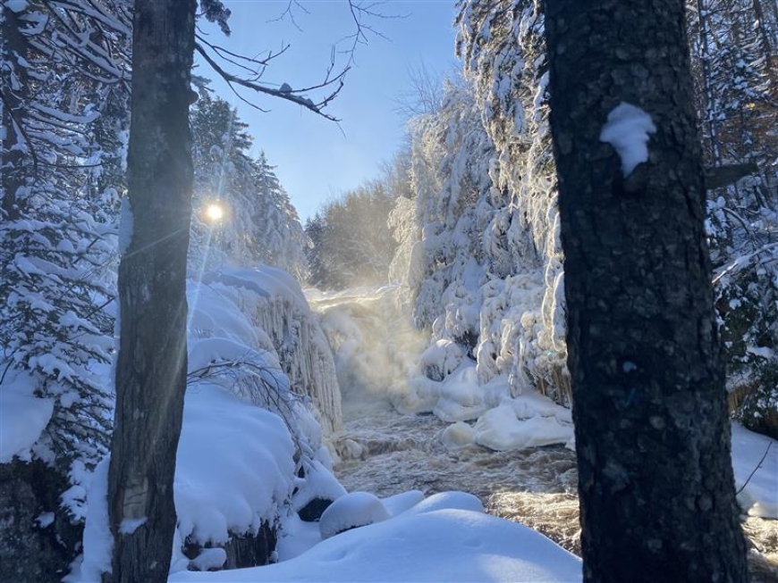These photos are from Nature Up North's first hike event of 2025, a snowshoe to Rainbow Falls. This trailhead starts on the Tooley Pond Rd, which is plowed but can be victim to variable road conditions. The trail is .3 miles to the falls and is largely flat, but features a wooden bridge at the falls built by the DEC, with a short jump up directly after. If you snowshoe to the falls, be aware of where there is real ground beneath your feet, and not drifts on top of treetops next to the gorge. Always stay within the treeline.