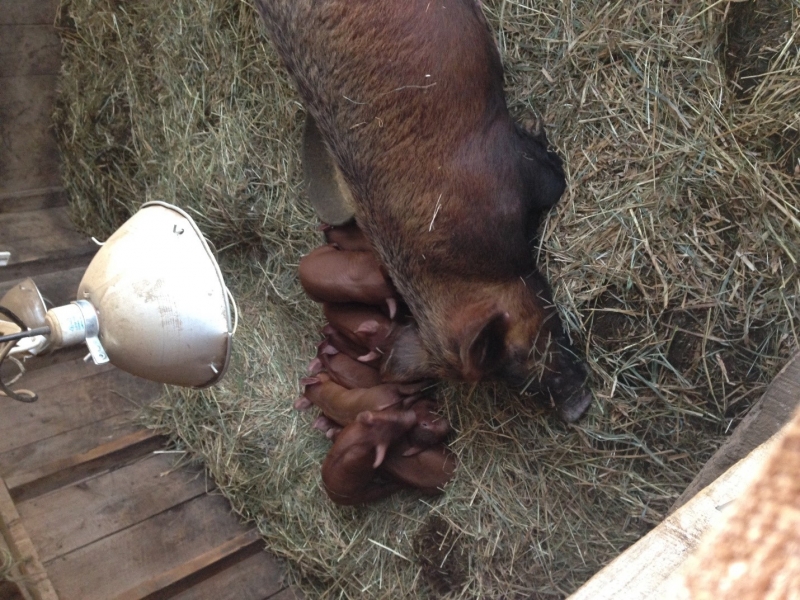 This is the first of two images taken at Bittersweet Farms. This picture is of a mother and her children. This pig gave birth about a two weeks before this photo was taken. Fortunately for the pigs in this liter, they were born closer to the end of the winter season. Another pig on the farm gave birth just a few weeks earlier in significantly colder weather and of nine piglets only one survived. Yet, of the newborns shown here not a single one of them died of cold or other complications. Natural History: Bittersweet Farms is an organic farm owned and operated by Anne and Brian Bennet. They raise chickens, eggs, heritage breed turkeys, Tamworth hogs, Scotch Highland cattle, St. Croix sheep, vegetables, herbs, and greenhouse transplants. They sell their products at the Canton Farmers’ Market. Bittersweet Farms has existed for fifteen plus years with Anne and Brian as the owners and operators. Additionally, Bittersweet Farms is located in rural New York and is surrounded by other farms and has lots of land for the animals to roam and live happily.