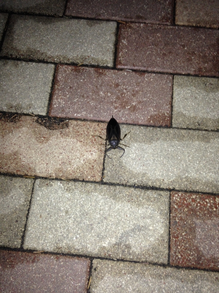 Nice find! These are often called Giant Water Bugs (from the family Belostomatidae). They're actually an aquatic insect that spend most of their time underwater, but I've read that they fly to migrate from smaller to larger bodies of water when it gets colder. This is the reason we sometimes find them exhausted on the ground this time of year.