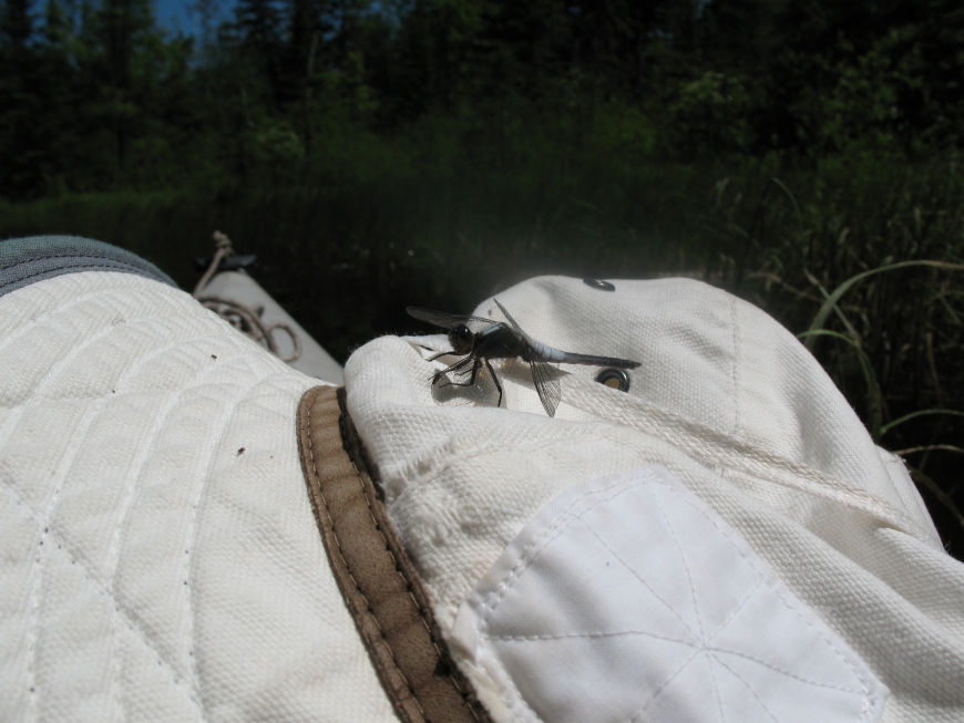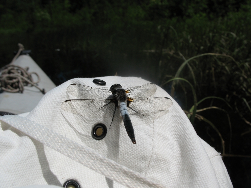I spent the afternoon watching dragonflies and damselflies from my kayak. A Chalk-fronted Corporal (Libellula julia) kept landing on my hat--the highest point in the wetland. I could hear the flicker of its wings as it landed, but I couldn't see it, so just after it took flight I transfered the hat to my extended paddle. When it returned, it hovered over my head for a few seconds then perched on the hat in its new location. Finally a good look at this beauty.
