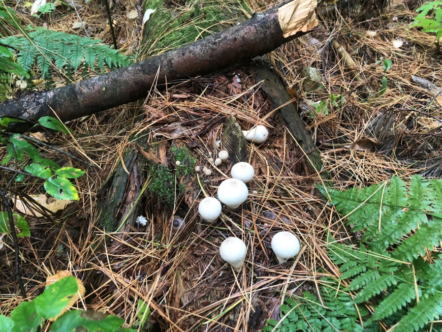 Found a few Puffball mushrooms in the woods behind the Canoe Shack at SLU! The common names of this species are the common puffball, warted puffball, gem-studded puffball, or the devil's snuff-box. The scientific name is Lycoperdon perlatum-- Lycoperdon translates to wolf farts, and perlatum means widespread.