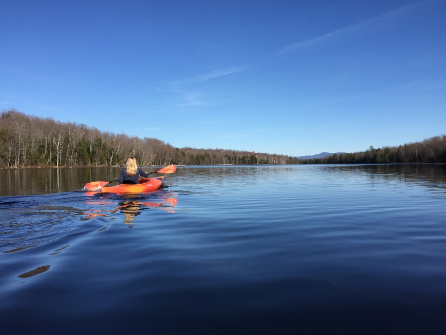 An ice-free Raquette Flow, clear skies, and temperatures near 60 made it a perfect day for the first paddle of the year.