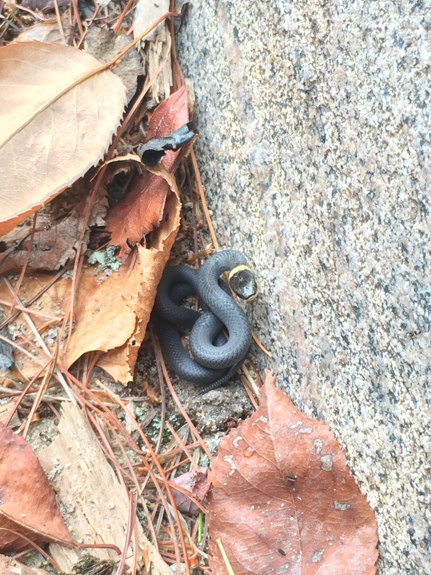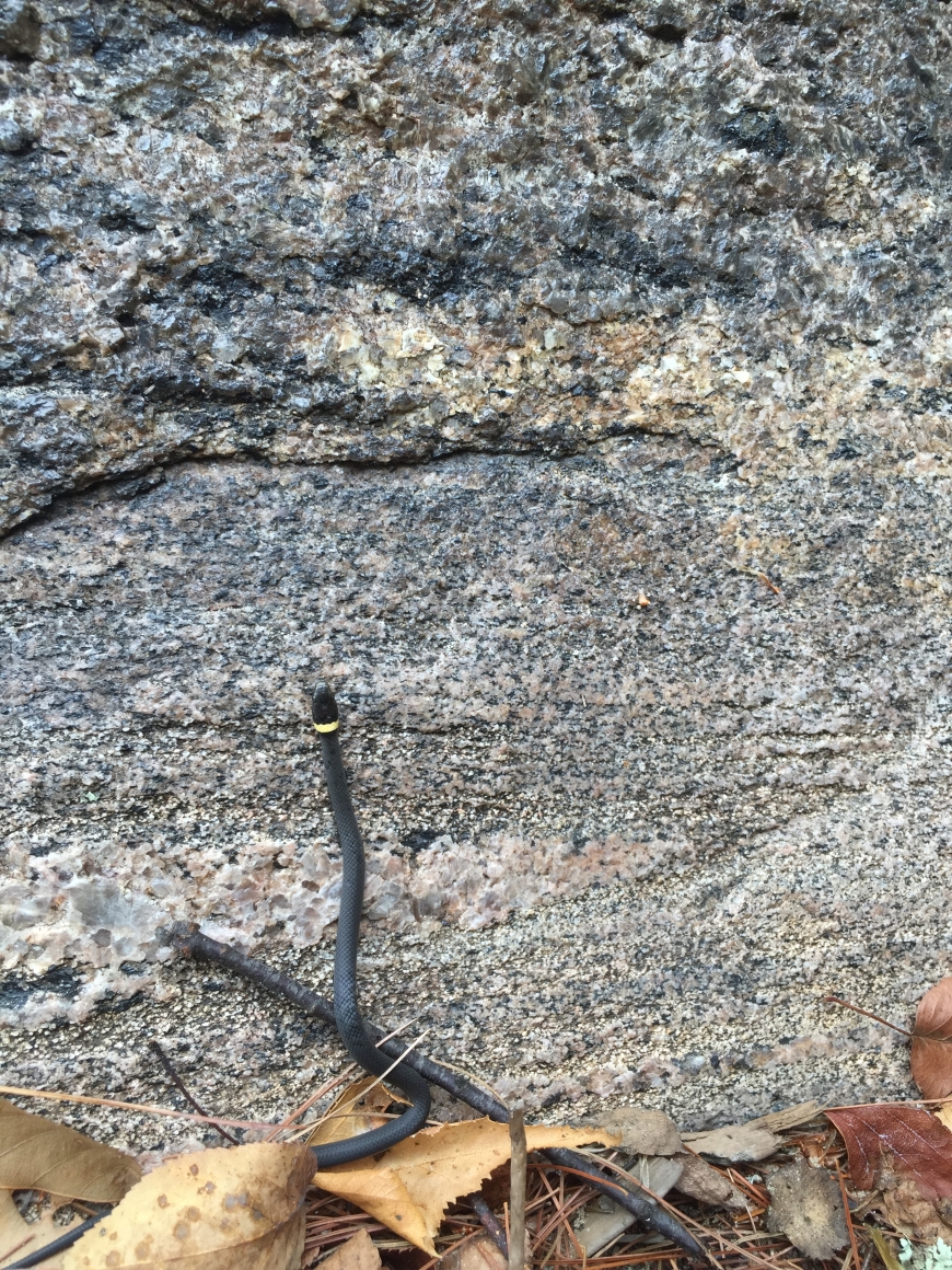 After a swim at Lampson Falls my sister-in-law went to put on her sandals, when to her surprise a young Northern ringneck snake was sunning itself on top of it. It quickly slithered off and hid in some leaf litter at the base of a rock. Northern ringnecks are not poisonous, and their diets consist of earthworms, insects, salamanders, and frogs.