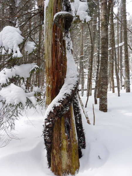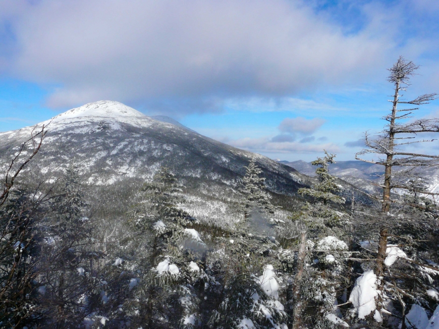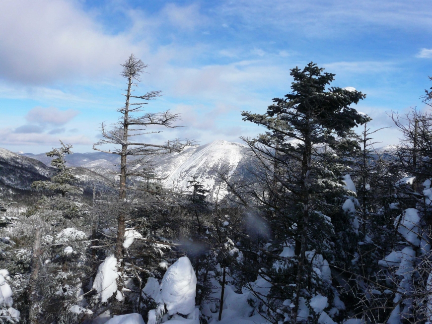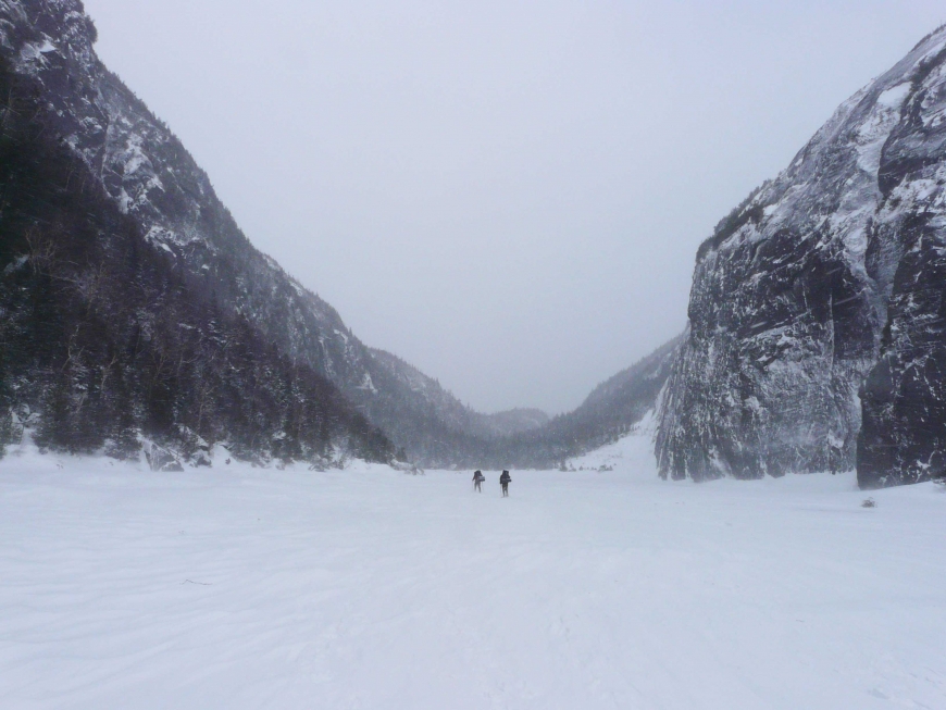 The day after a March blizzard, a friend and I set off from the ADK Loj for an attempt on Mt. Marshall. Avalanche Lake was frozen solid, enabling us to avoid the chutes and ladders of the established trail and hike directly across the lake ice. The steep walls of the gorge were spectacular, but also funneled the bitter wind directly into our faces. We reached the base of Mt. Marshall later than expected, and discovered that the trail had not been broken recently. We forged on nonetheless, and after losing the trail we opted to hike directly up the stream bed, frequently postholing into waist deep snow. It was tough work, but we eventually gained the ridge towards the summit. The cloudy morning had turned into a bluebird afternoon. After more bushwhacking and several awkward struggles to remove ourselves from multiple spruce traps, we reached a false summit with nice views of the McIntyre Range and Mt. Colden. We were painfully close to the true summit, but separated by a steep bowl full deep snow (and no doubt more spruce traps). Satisfied with a nice view, we opted to turn towards home. After sunset, a waxing gibbous moon gave us enough light to hike out without headlamps.