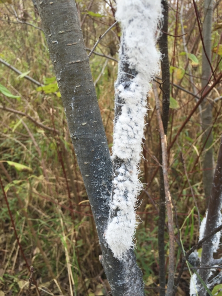 I noticed these white masses of woolly alder aphids on alder plants on the edge of a wetland. Intrigued, I decided to do some research. Woolly alder aphids are parasitic on alder and maple trees, forming colonies and sucking the sap from the stems. They produce white fuzzy fibers that make them highly visible, but also unappealing to predators. Woolly alder aphids require alder and silver maple trees to complete their life cycle. Wingless aphid nymphs are born on silver maple trees in spring, where they feed on new leaves. For most of the summer woolly alder aphids are wingless and asexual. However, by mid summer, some individuals develop wings and begin to reproduce sexually, and fly to nearby alder tree to start new colonies, which are comprised of aphids in all developmental stages. Wingless aphids will overwinter on alder trees, where they produce female clones asexually. Some winged aphids find their way back to silver maple trees, where they lay eggs that overwinter in the cracks of the bark.