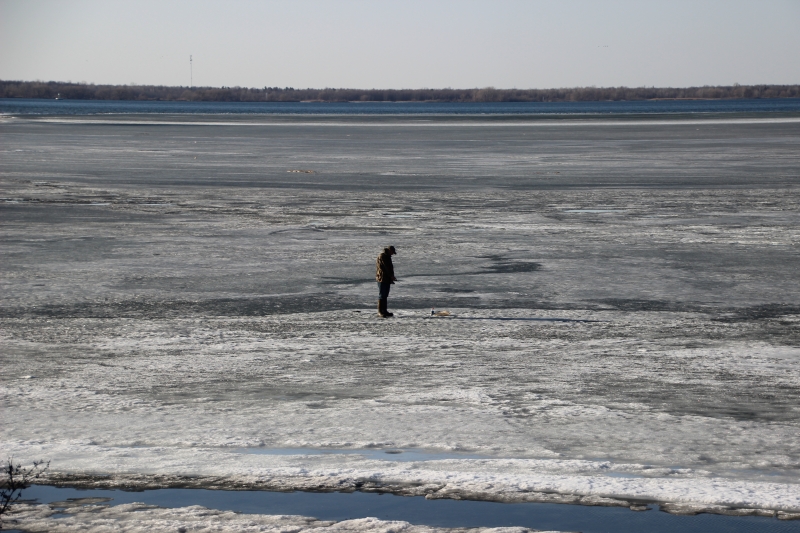 Driving along the St. Lawrence between Massena and Waddington..one man standing out on the ice despite serious spring melt and even some open water between him and the shore...does that seem like a good idea?