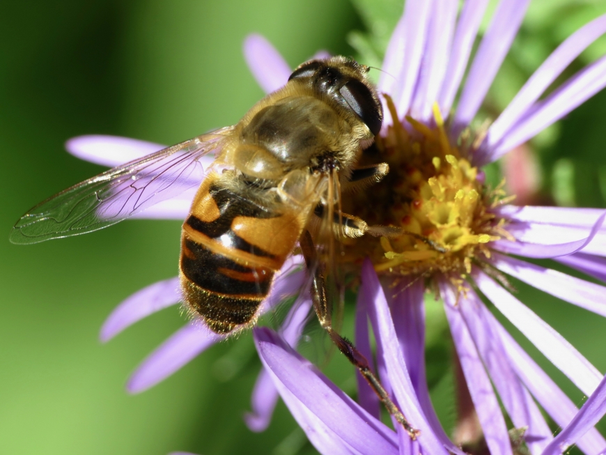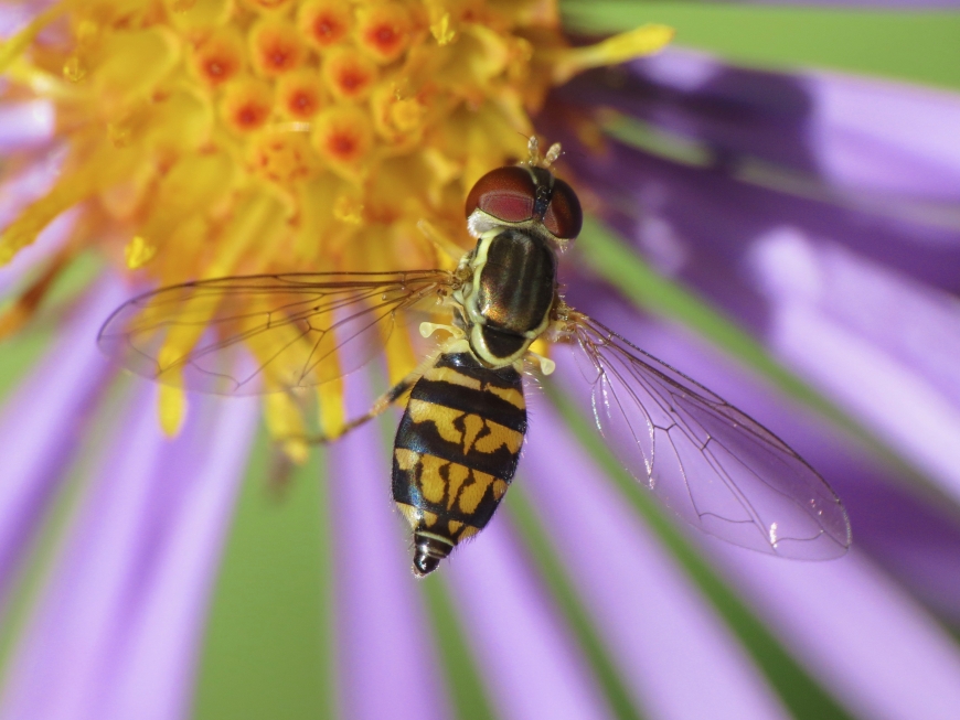 Lots of flower flies were out this morning at Indian Creek Nature Center. Many species of flower fly are bee or wasp mimics, and they certainly looked very bee-like as they buzzed around the New England aster.