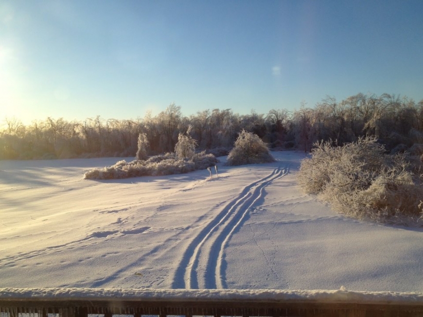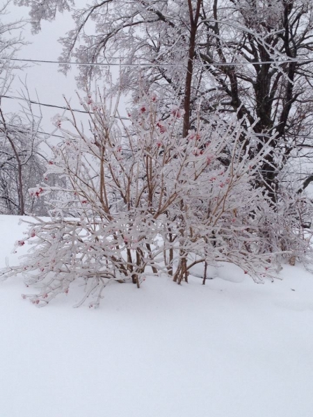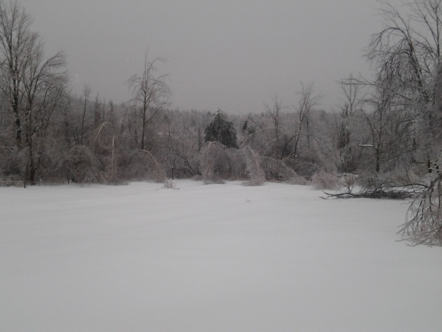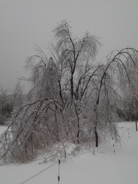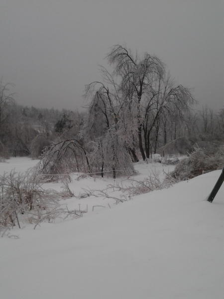 Friday night we started to get lots of freezing rain. By Saturday morning, we had a good glaze. Around 1, the cable went out, and by 4 the power went out, as freezing rain continued. The freezing rain continued until Monday. It was amazing and sad to hear the trees popping and cracking. We got power back Monday evening. Luckily at that point, the outdoor temps hadn't dropped too badly, and we could maintain a reasonable temperature in the house with just fireplace heating. We ran the generator sparingly, as we had a limited supply of gas to run it. The hardest part was not really have great access to news and information. I think the next household purchase will be an emergency radio.