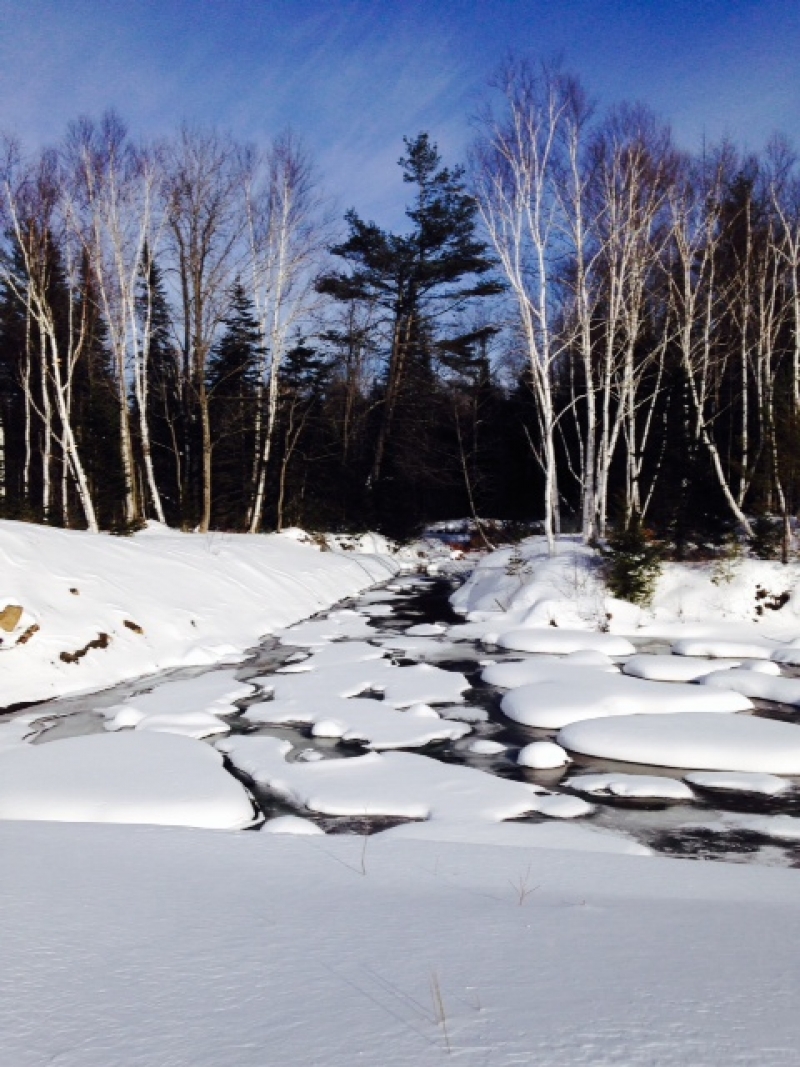 LANDSCAPE: This photo was taken at Garnet Hill, a x-country ski place close to North River, NY. It is protected state land with miles of groomed x-country trails and hiking/biking trails in the summer. Amongst the Adirondack mountains, it is mostly forest and woodland with a view of Thirteenth lake. There is a garnet mine close by and the tailings left over from the mining piled up and created a pond right near where this picture was taken. I really like the snow pillows that formed on this little river and the way the birch trees frame the edges of the photo.