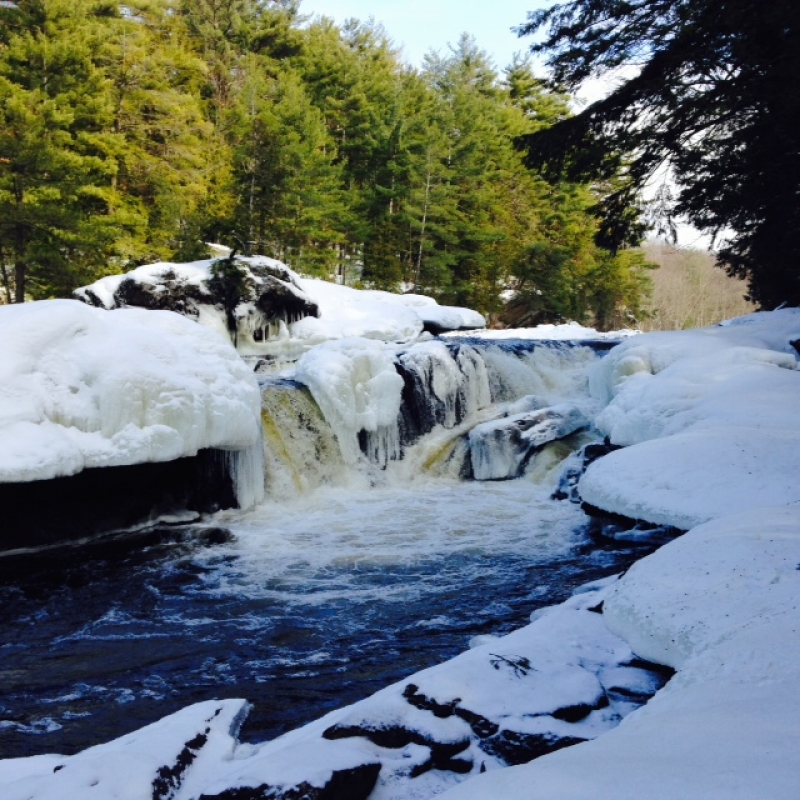 This photo was taken at Stone Valley, a recreation area with a few miles of ADK trails on both sides of the river. The river here flows against the bedrock "grain" which can make interesting marks (like potholes) in the rock. Both sides along the river are heavily wooded. I find this photo interesting because of the contrast in trees - bright green where the sun is and almost black in the shadows. I also like how powerful the water looked at this waterfall.