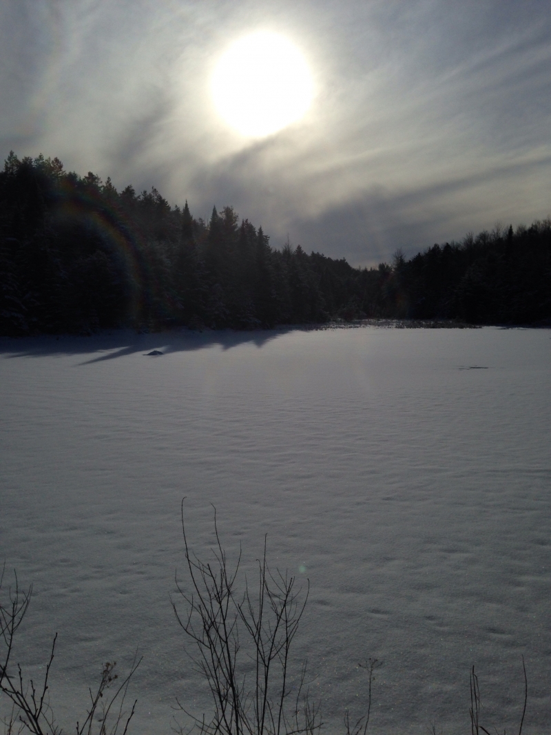 I thought this would be a beautiful image as we skied across this frozen pond. It seemed to be a large wetland area stretching about 150 feet across. The bright sunlight and the glistening of the snow on the ice made for the perfect opportunity to score a nice picture. It really made me want to go ice skating!
