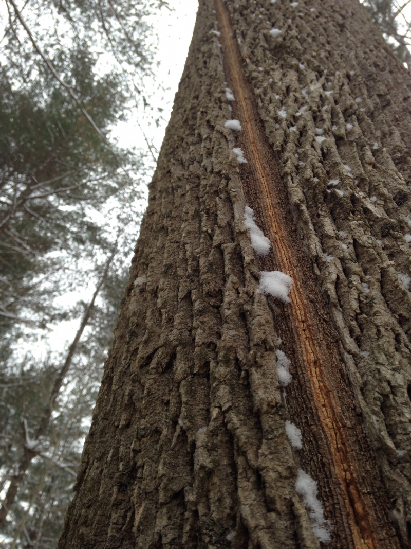 In this primarily hemlock-beech forest I discovered an Ash tree with a long scar running down the length of the trunk. I figured that this would be a good display of tree growth and how they adapt to life in the North country. I took a shot facing the sky in order to give you a better perspective of how long the scar was and so you could see it twist up the tree. It also captures the intricate pattern of the bark.