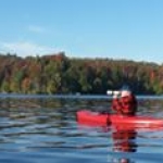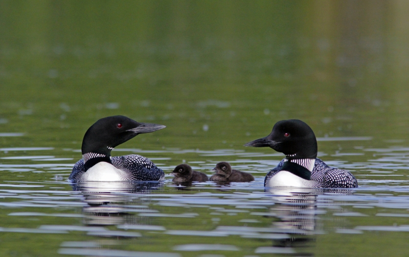 From my kayak on Lake Ozonia, I was delighted to be able to photograph loon parents with their two young chicks when they swam into an almost perfect family formation!