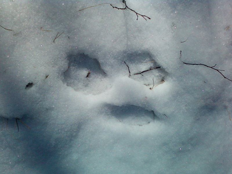 Rabbits' larger hind steps jump over the smaller steps and point in the direction of its movement. This is quite intuitive but I found it very interesting when I learned that fact this year, since I have absolutely no experience tracking, nor am I familiar with a wide variety of animals. A significant amount of information can be deduced from animal tracks including speed (from the gait), direction of travel (from the direction of the paws or stepping characteristics in the case of the rabbit), and sometimes even intention (climbing up a tree, escaping prey, seeking food, shelter). Other logistical facts such as time/date of animal presence can be reasoned through observing qualities of erosion and compilation. Damage on plants also suggest a series of specific events that indicate the presence of other animals. A careful, experienced observer of tracks can see a detailed tale of the wildlife in every corner of the outdoors.