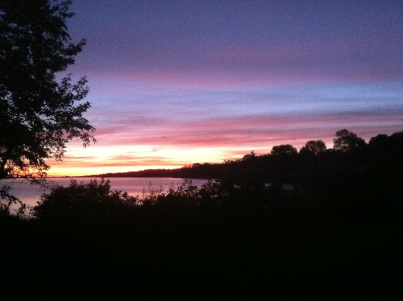 A beautiful sunrise on the St. Lawrence River at around 6 am. Blue herons were hunting along the shore while seagulls flew over the water.