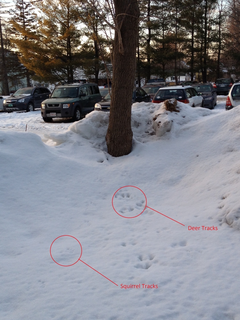 In the late afternoon, just when you wouldn’t think there would be any animal activity in mid to late winter, two kinds of animal tracks were discovered about 10-15 ft outside my dormitory around an entrance that is not commonly used by its residents. What appeared to be squirrel and deer tracks, left two trails that lead to and from a young maple tree. Both animals are very much active during the winter, utilizing this tree for sustenance until spring brings around lush, green trees and grass.