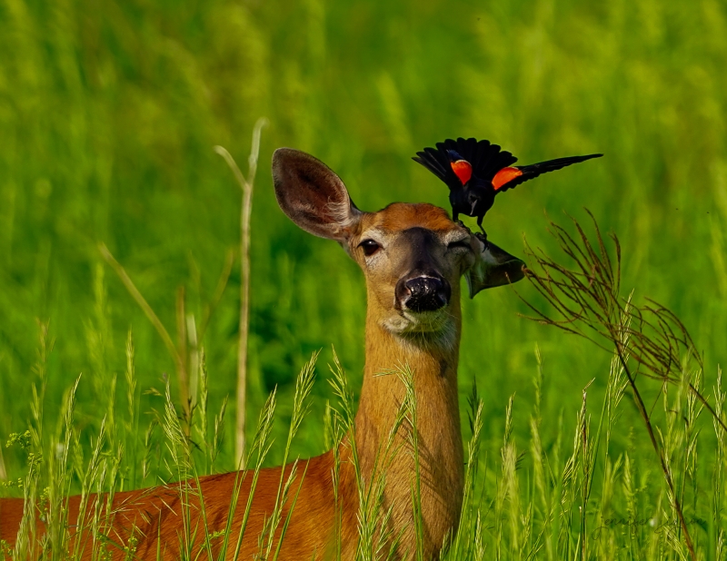 I was watching for a nesting kestrel pair when I heard a commotion. It seems this doe got too near a red winged blackbirds nest. The birds were relentless but she was too busy nursing her fawn to be phased. Fawn is hidden by tall grass.