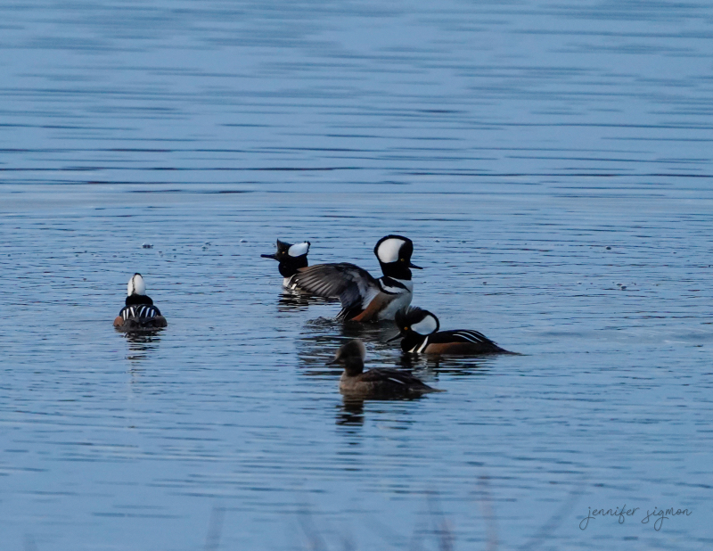 On my morning walk I spotted a group of hooded mergansers showing off their interesting plumage