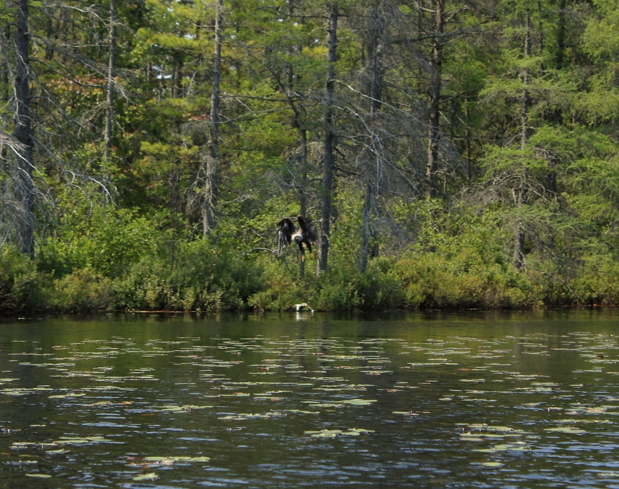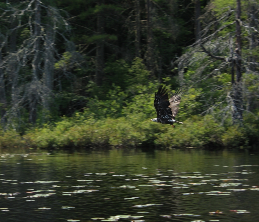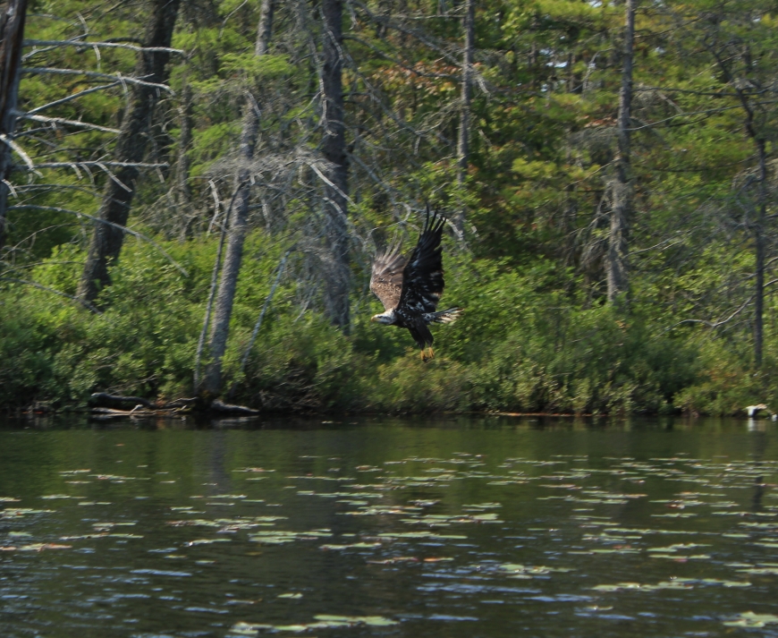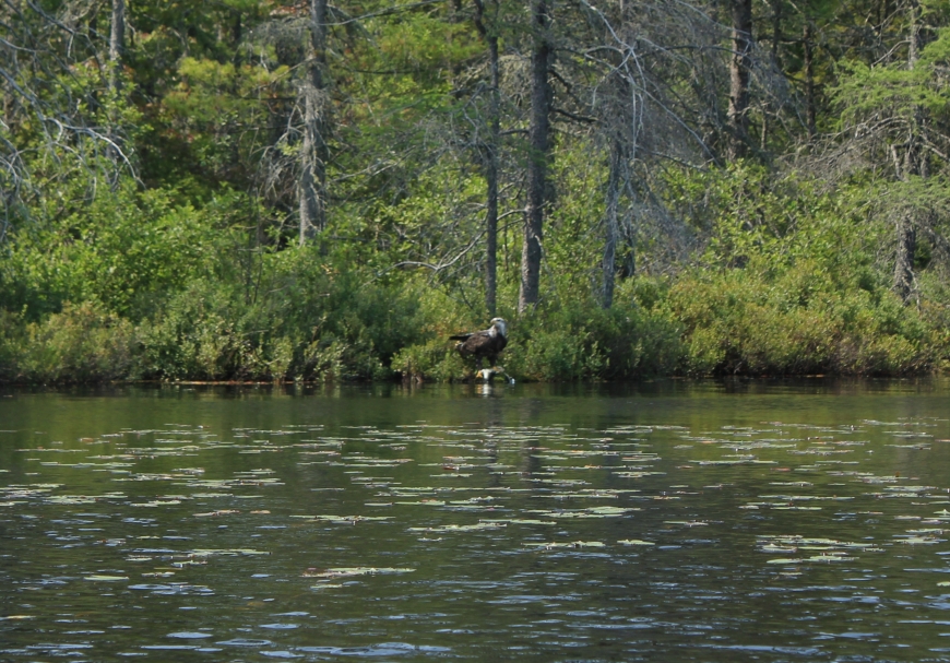 Kayaking through Fish Creek yesterday I saw movement along the shore, which at first I thought was someone pulling their kayak onto a carry over. At second glance, I realized that this was a Bald Eagle pulling apart a fish for lunch. I approached it slowly and tried to snap a few quick pictures but didn't want to disturb it. My guess is that this was a young eagle who had just matured because the head wasn't entirely white yet. You can still see a little brown streak along the side.