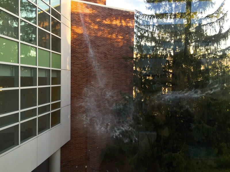 This perfect imprint of a bird in flight was pointed out to me at the Johnson Hall of Science at St. Lawrence University. Someone had apparently seen the bird hit the glass and assured me that it flew off and was okay. I can't say i've ever seen a mark quite like this left behind on a glass window!