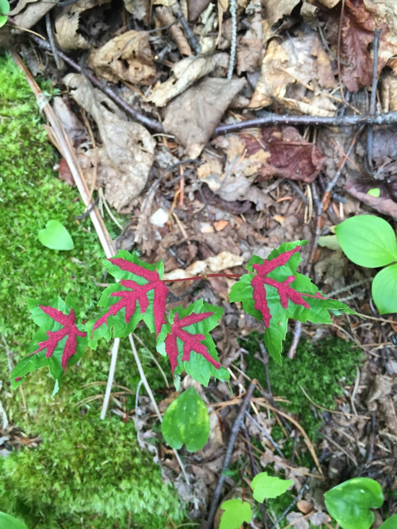 Can anyone help me identify this mysterious pink coloration? Is it a fungus? It looks quite beautiful growing along the veins of these maple leaves, but I'm not sure if it is harmful to the plant.