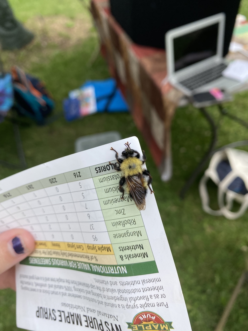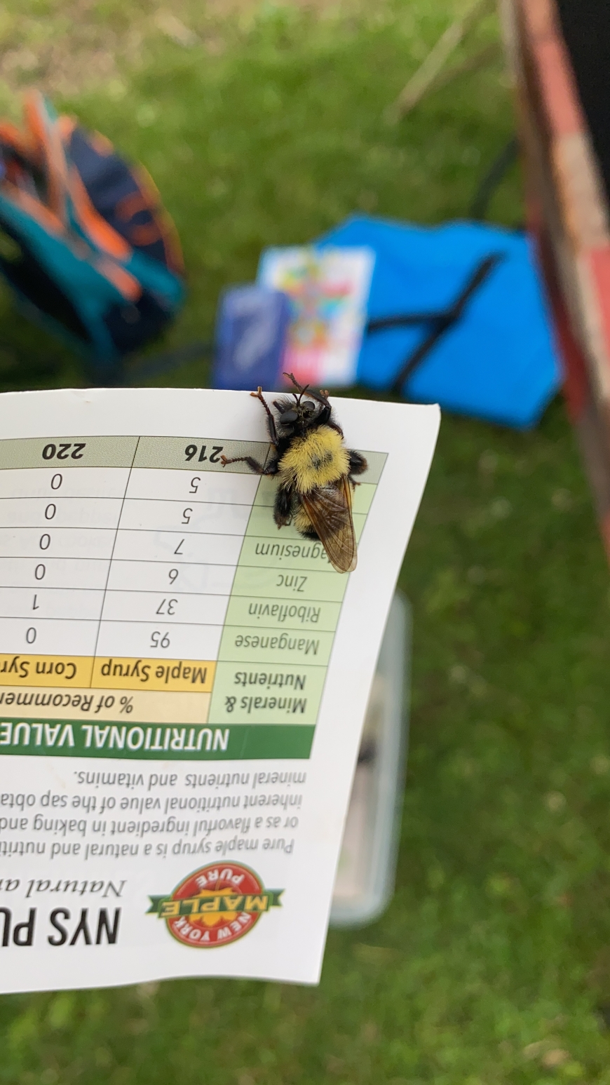Visited by a bumblebee robber fly at the canton farmers market! These flies are cleverly disguised as bees with their yellow and black coloration and fuzzy bodies - but a closer look and a few clues will give away their status as flies (members of the Diptera order). First - this guy only has one pair of wings. Bees have two pairs! He’s got short antennae, and his eyes are more round whereas bees generally have oval shaped eyes. Finally the giveaway that this isn’t just any fly, but a robber fly - the mustache (technical name: mystax, a collection of stuff bristles on the face). Robber flies are incredible predatory flies that eat mainly other insects by waiting in ambush and catching them in flight!!