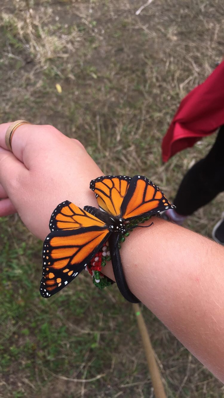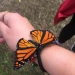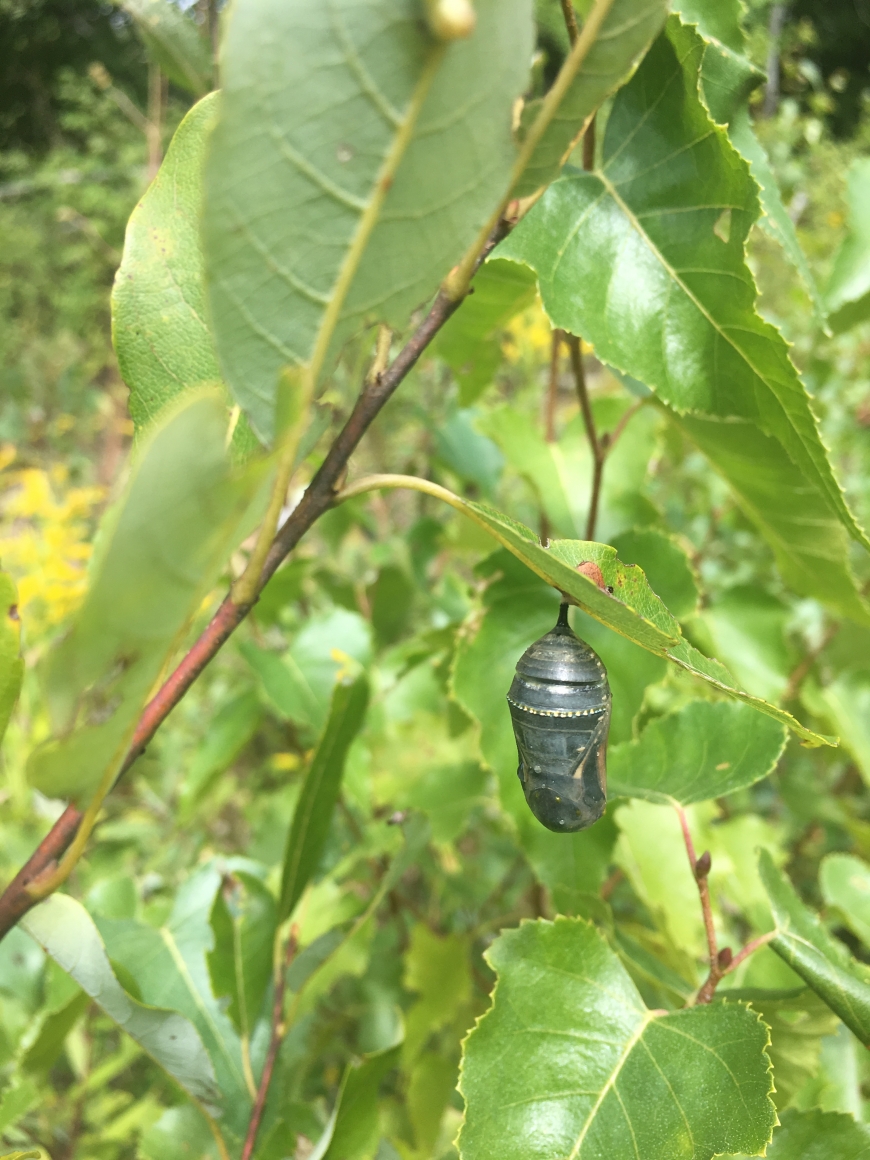 Traveled to Parishville Sand Dunes to look for insects, and in the parking lot I spotted this dark, nearly see-through chrysalis. When we came back down to the parking lot an hour later the chrysalis was gone, a little bit of searching revealed the newly emerged monarch expanding and drying its wings!
