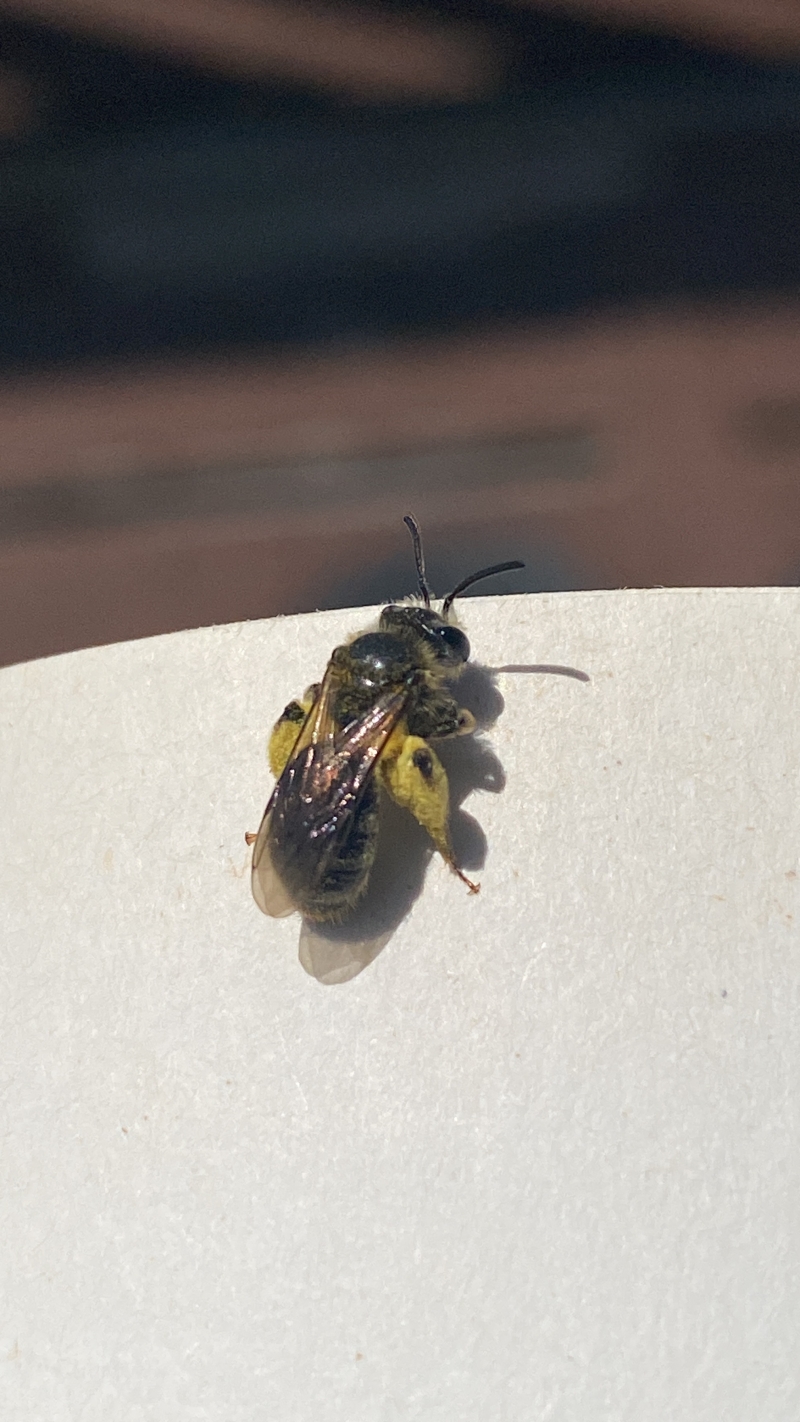This little bee kept coming back and landing on my book and my sweater while I was outside. I was wearing a yellow sweater with flowers so he may have liked that. When the little friend was on my book he was rubbing his antennae and legs - and you can see how full the tibia on its hind legs are with pollen! So cool!