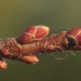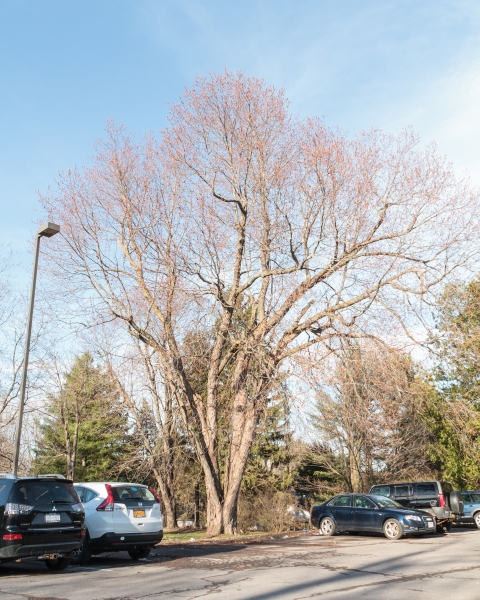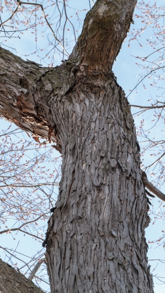 Silver maple (Acer saccharinum) has shaggy, grey bark (smooth on young trees) and oval-shaped, brown-and-red buds. This tree is flowering; I will add a photo of the flowers when I get one.