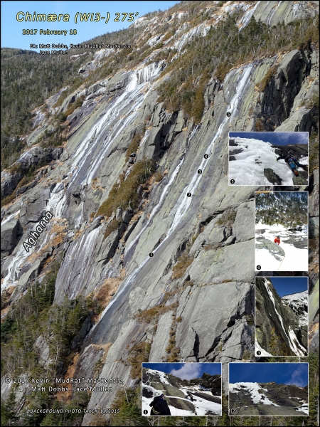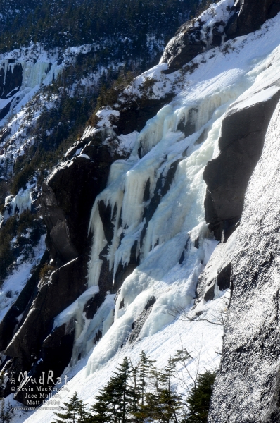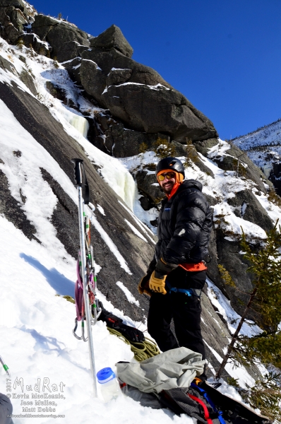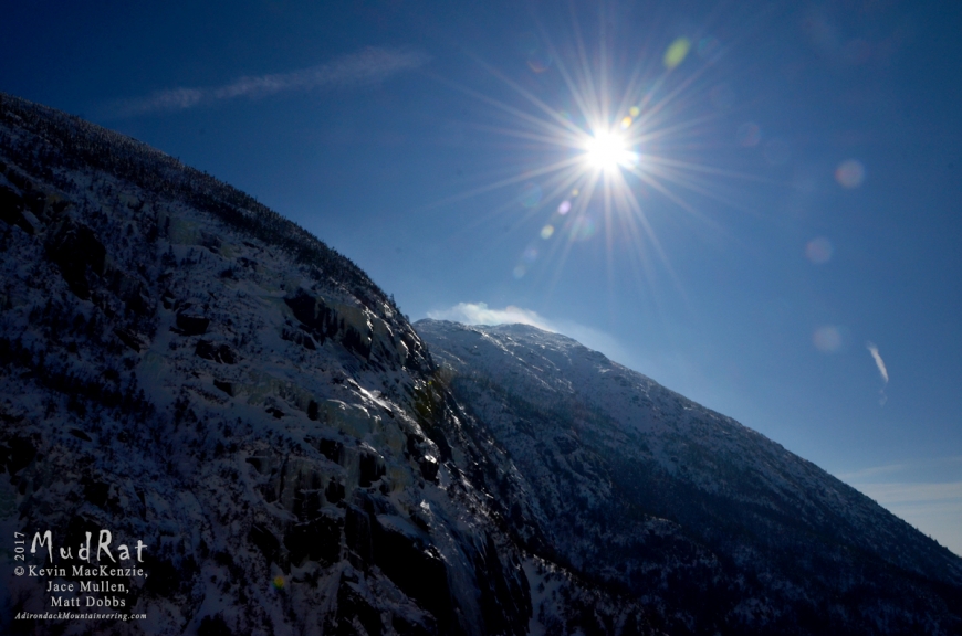 The Feline Wall, about ¼ mile into Panther Gorge on Mt. Marcy, sometimes hosts a thin ice smear down its center line. It seems reliable in that it forms every year. The caveat is that it is thickest at the top where the water feeding it seeps from the krummholz. Sun heats the dark underlying stone and often delaminates the bottom portion. Whether it is bonded to the anorthosite when one visits, is a persistent wildcard. Temperatures were forecast to be in the 40’s F in the Keene Valley; a little elevation should have kept it in the 30’s on February 18th when I and friends Matt Dobbs and Jace Mullen went searching for ice. Only when I returned home did I find out that the thermometer in the shade had reached about 60. This explained the conditions we encountered, but I’m ahead of myself. I picked Matt up at 3:40 a.m. We met Jace at the trailhead and began hiking the hard-packed trail by 4:40. Some mornings we are chatty, but only short conversations broke the silence as we each struggled to wake up. The sun breaking over the ridge to the east a couple hours later aided the effort. Blue skies and occasional winds accompanied the trip from Slant Rock to the Haystack intersection. I scanned the cloudless sky and wondered how this would bode for climbing. READ MORE HERE: http://www.adkhighpeaks.com/forums/forum/adirondack-slides/slide-climbi…