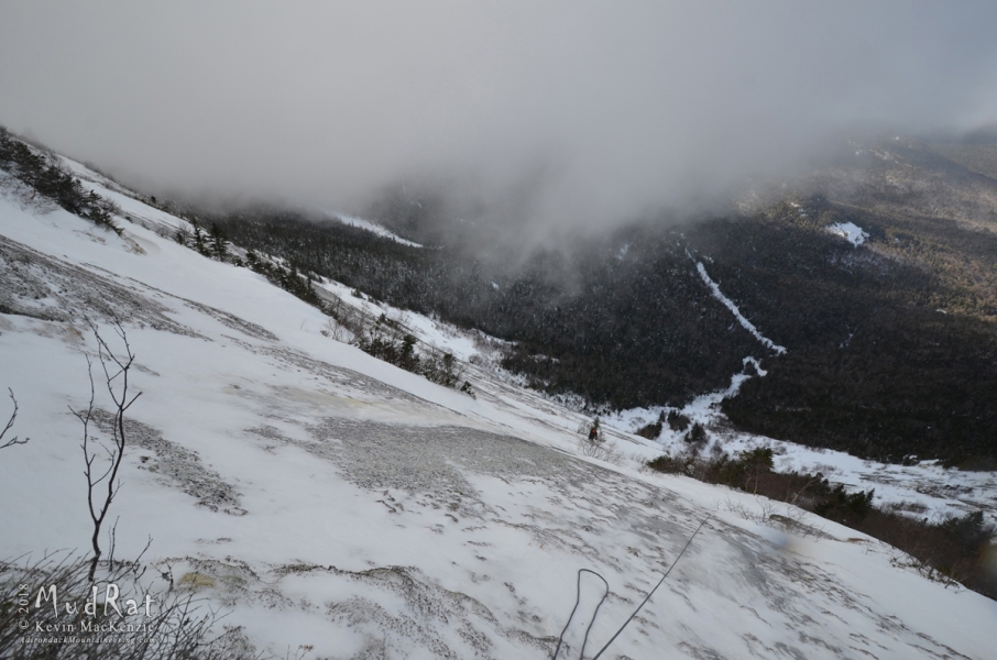 Ranger Scott and I tagged Gothics’ North Face yesterday. I’ve never gotten on it during November so this was quite a treat. We took a chance and had a great day as a front moved in. I feared it would be covered with some un-bonded snow, but we found a mixed back of snow climbing, ice climbing, and scratching up bare rock. The approach involved breaking through a couple feet of virgin snow from the Orebed Trail to its base. Clouds enveloped us and strong winds pounded drove the spindrift as we climbed the top 400’ to the ridge where we found 4-5’ of snow. Real winter conditions are on the summit. In all we had a 13 hour day.
