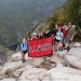 The slide is mostly clean which makes for good friction climbing. What mud is still leftover lies primarily in small obvious clumps except just below the headwall…the top segment of slab. Different students chose different routes up the footwall of the slide as they exited the Trap Dike. By now, I’d taken over 200 photos and made great use of the SLU banner that Sam kept in his pack. We finally broke through the cloud ceiling at about 4,300 feet in elevation…they’d lifted over 1,000 feet since the beginning of the climb. The top of the slide was wet and visibility dropped to around 75 feet. Moments later after a short bushwhack, we were seated on the summit proper celebrating a successful and safe climb! The time was only 11:45 a.m.