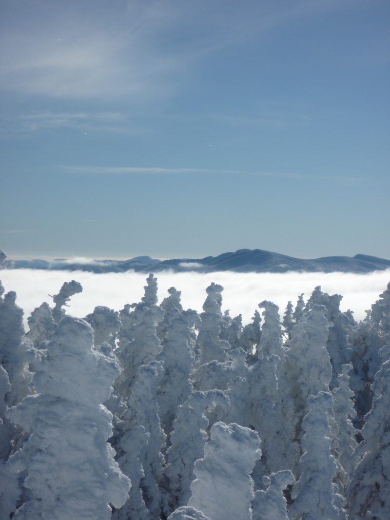 The Balsam Fir, a soft wood tree found throughout the Adirondack Park, is very resilient to the tough winter conditions experienced. Pictured here is a Balsam encrusted in snow and ice on the summit of Blue Mountain, in Blue Mountain Lake, N.Y. The waxy needles allow the tree to shed snow. In many cases the extreme conditions stunt the trees growth, making the tree grow at a much slower rate that the same species at a lower elevation. The caked trees and sea of clouds make this picture a true inspiration.