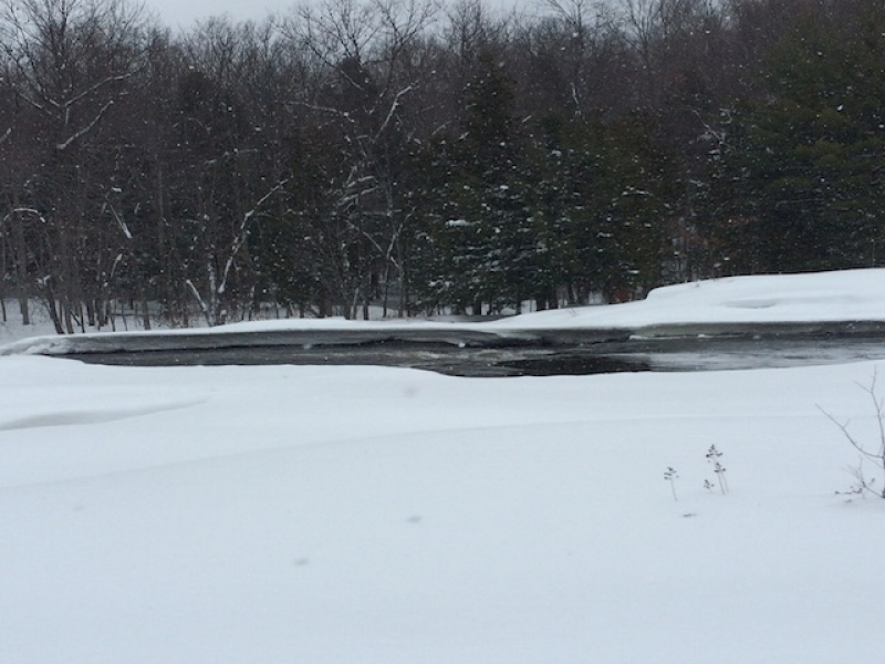 Natural History Info: As with the other pictures of bodies of water, this thawed, flowing body of water is still moving despite the rest of its surroundings being completely frozen. This is possible because a larger body of water will take more time and require colder temperatures to freeze completely. This contrasts to the surrounding snow that fell from the atmosphere above, as the water/snow particles are quite small as they fall and thus can more easily freeze.