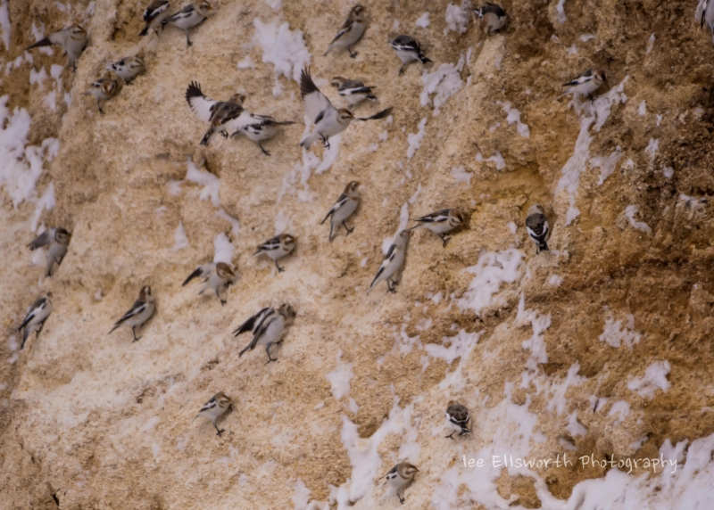 Snow Buntings feeding on a Silage Pile