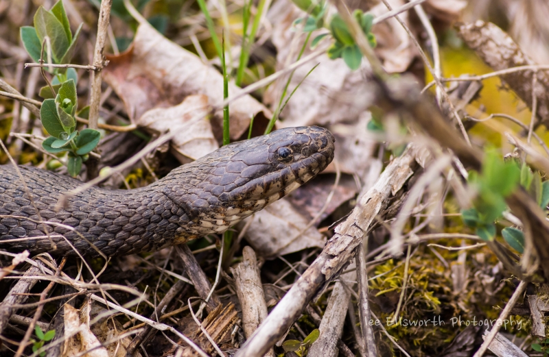Snake was in a old stone wall almost a mile from Perch River marsh. I had previously seen it earlier in the week sunning partially out of a rock hole. Found it completely out today. At first I thought it was a Rat Snake, being so far from water. I learned they will den with Rat snakes and Copperheads - which are not native to our area.