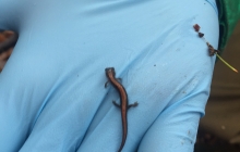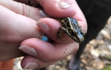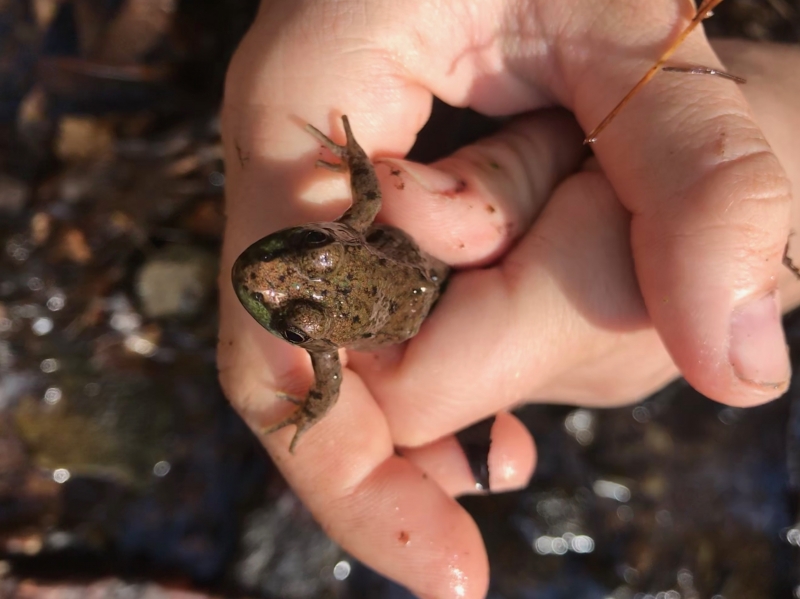 A green frog (Rana clamitans, adult) found in a small stream at Glenmeal. Wasn't thrilled to be having its photo taken. This green frog appeared to be a female, as she lacked large nuptial pads.