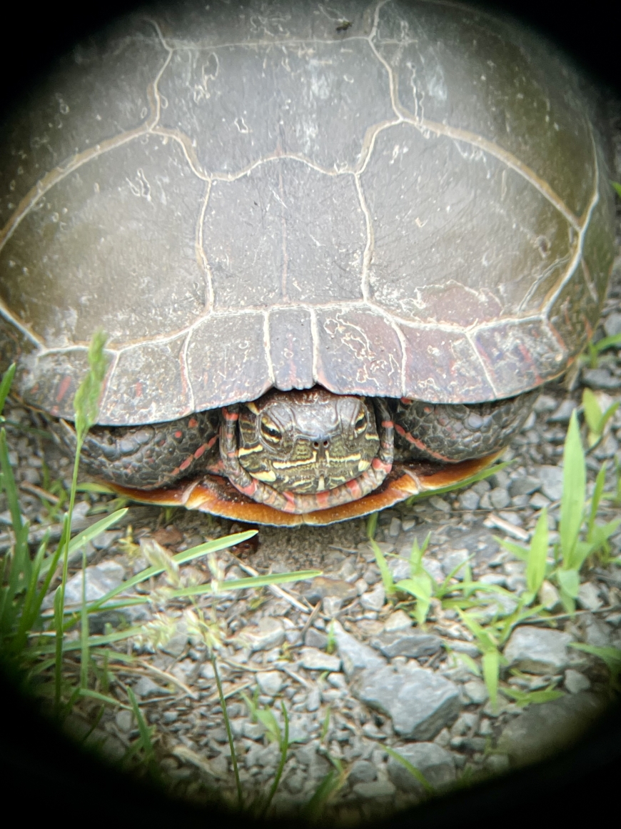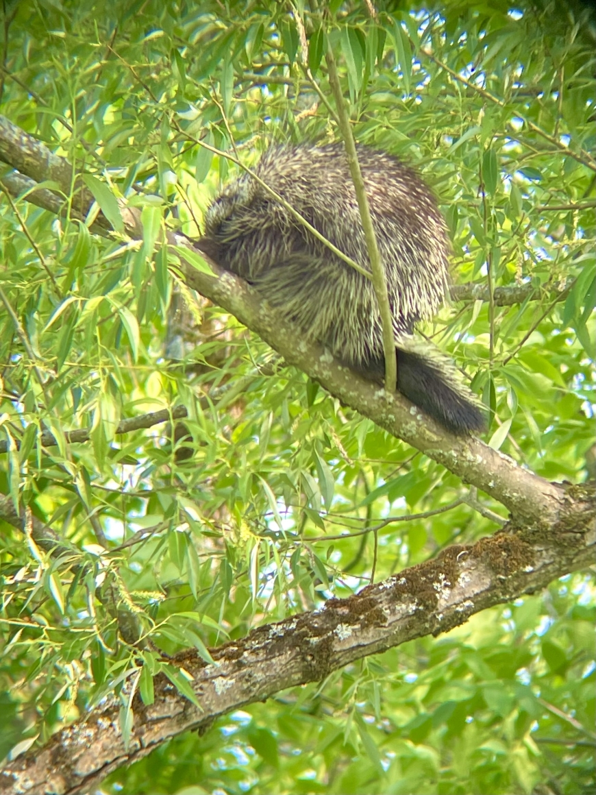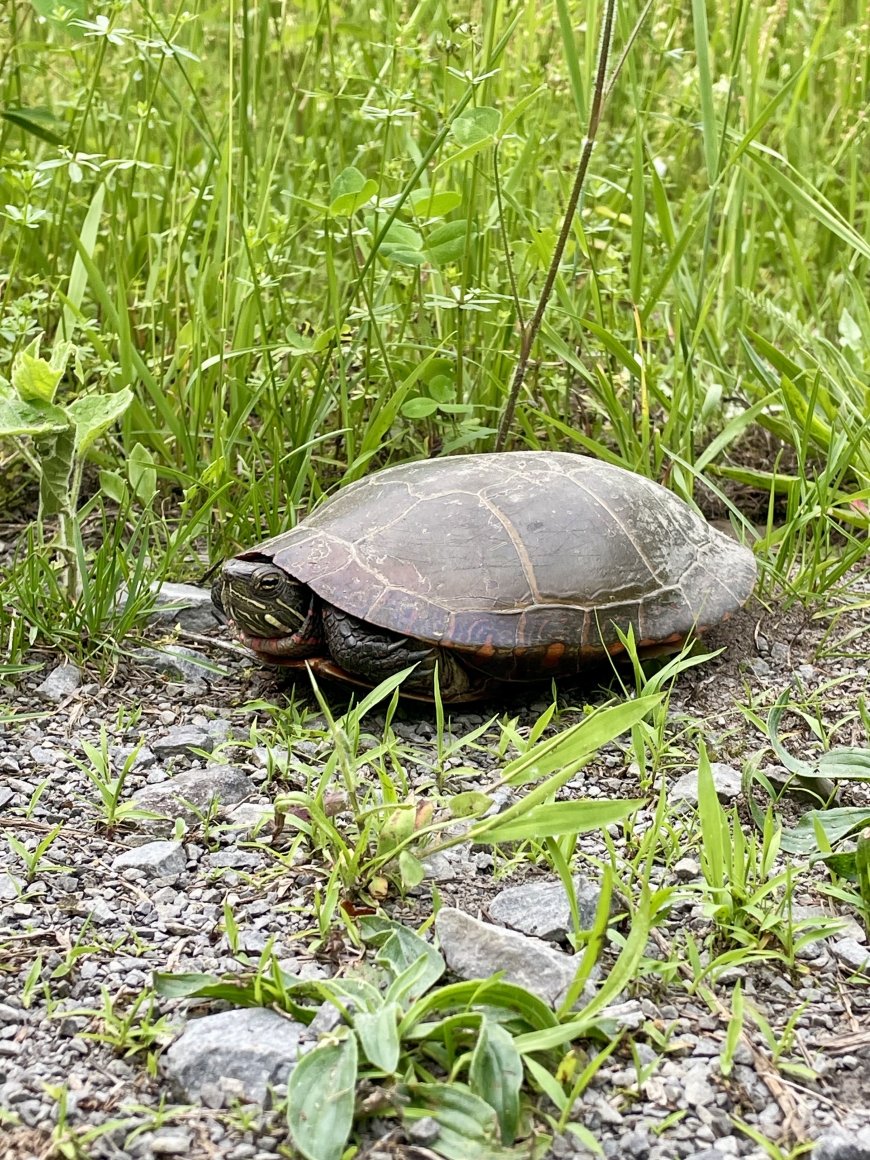 I went for a walk on the Saddlemire Trail with my binoculars with the intention of looking for birds. I did find many birds (including American Redstarts, an Eastern Meadowlark, Yellow Warblers, and more) but I also saw a porcupine and a painted turtle! The porcupine was taking a nap up in a tree, and was still there when I passed by again on my way back. The painted turtle was on the side of the trail poking its head out of its shell near a patch of wild strawberries. These encounters were very special!
