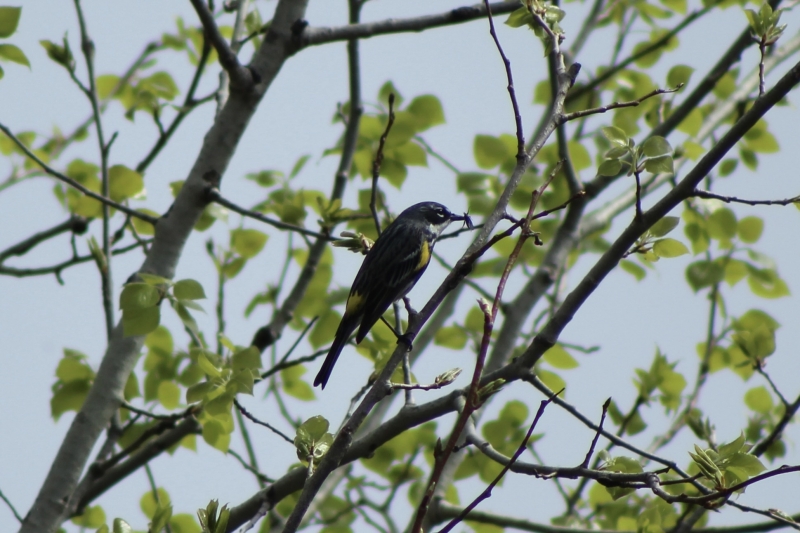 I went for a birding walk on the Remington Recreational Trail today in order to study for my ornithology final (where we'll be identifying birds along the trail). We saw and heard 30 species total, and I was able to get pictures of a few, including this Yellow-rumped Warbler. It was only when I looked back at the photos and zoomed in that I saw the bug in their beak!
